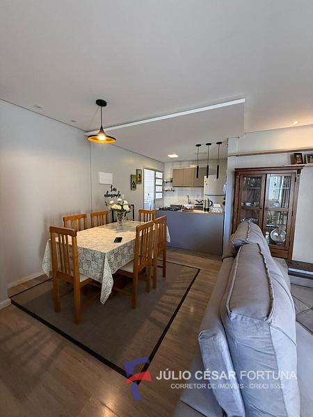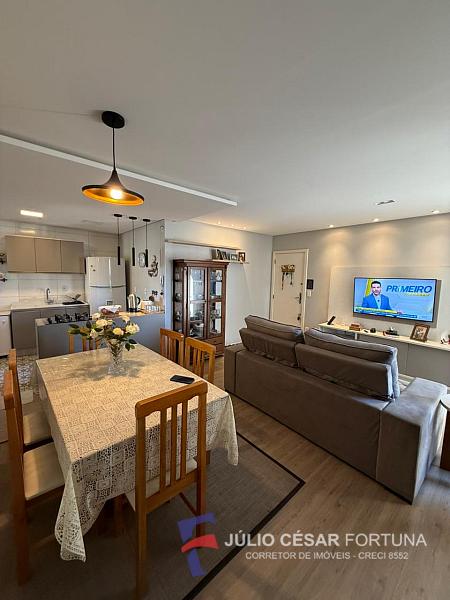 O charme do imóvel fica por conta da ampla sala de estar e jantar integrada com sacada e cozinha em ilha. Além disso, possui piso laminado, detalhes em gesso e está semimobiliado.
