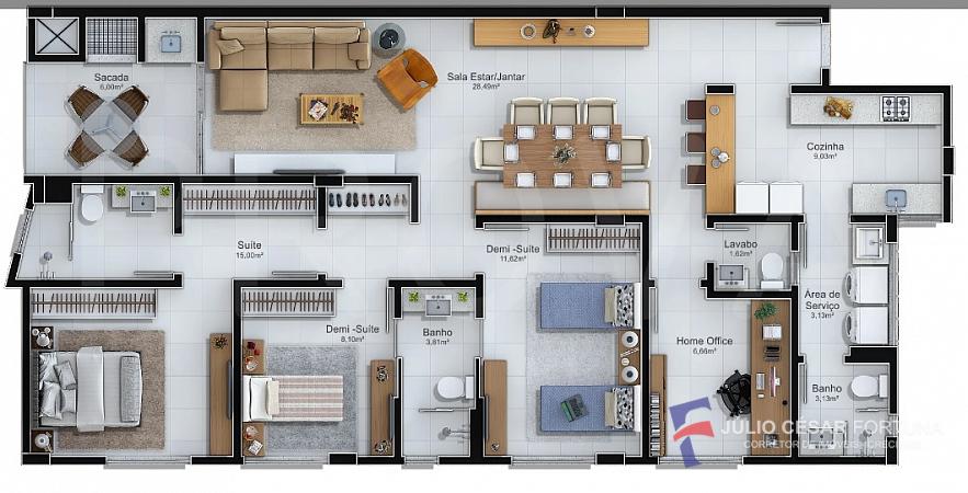 Amplo apartamento com 127m² privativos, com 3 suítes (sendo 2 demi-suite), lavabo, living com 2 amplos ambientes, home office, cozinha, área de serviço separada, banheiro auxiliar, espera para split.