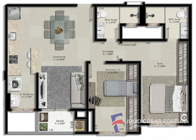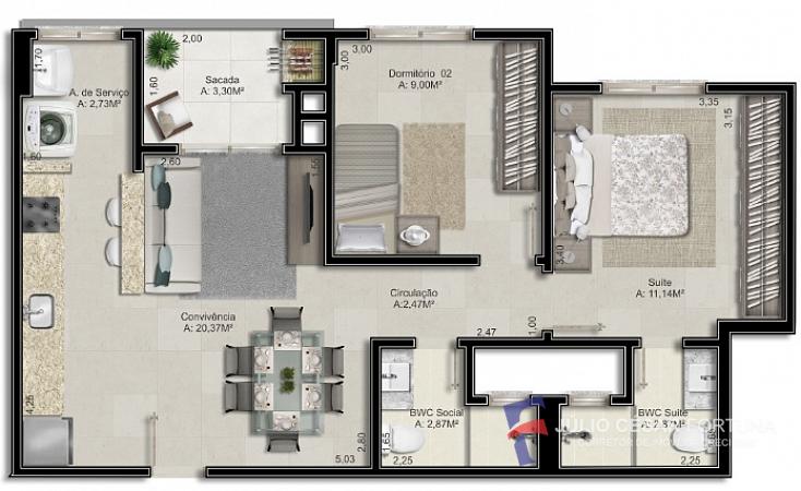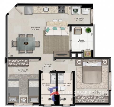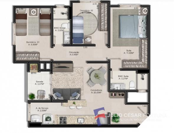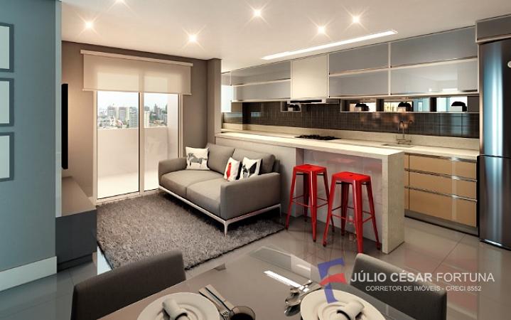 Apartamento com 03 dormitórios sendo 1 suíte, Sala e Cozinha integradas, Sacada com Churrasqueira, Área de Serviço, Banheiro Social.