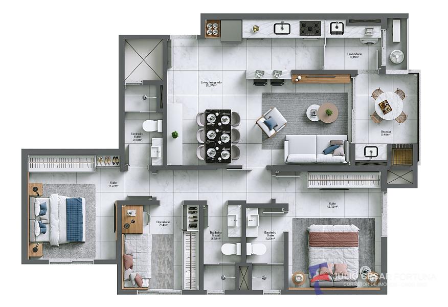 Apartamentos 3 dormitórios sendo 2 suítes, amplo living com 2 ambientes, sacada com churrasqueira a carvão, cozinha e área de serviço, 1 vaga de garagem.