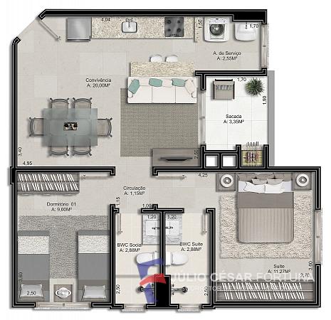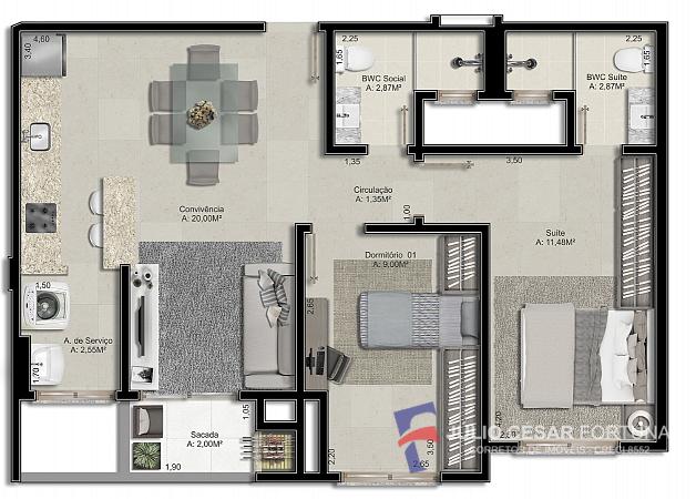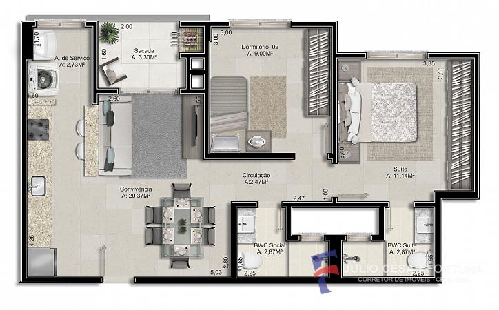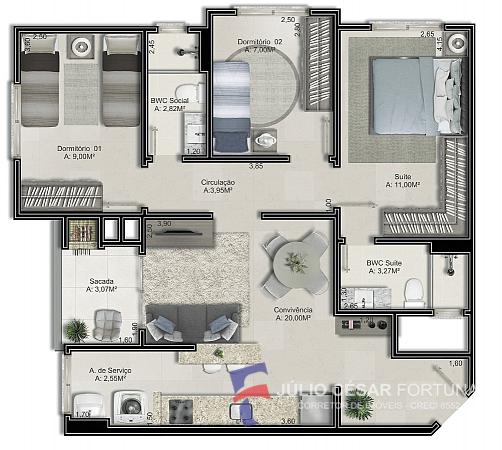 Apartamentos com 3 ou 2 dormitórios sendo 1 suíte. Sacada com churrasqueira, living com 2 ambientes, banheiro social. Espera para split na sala e dormitórios. 01 vaga de garagem.