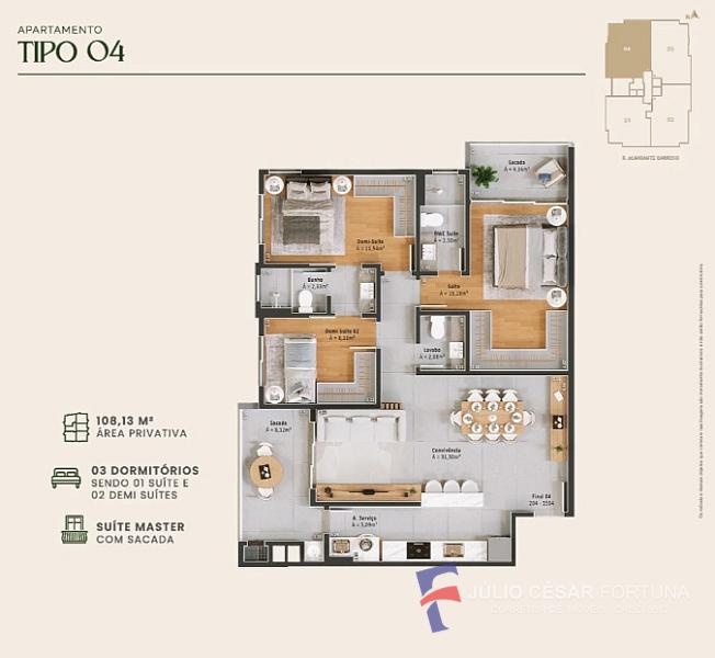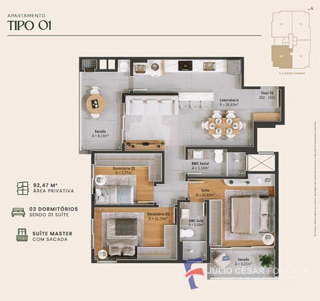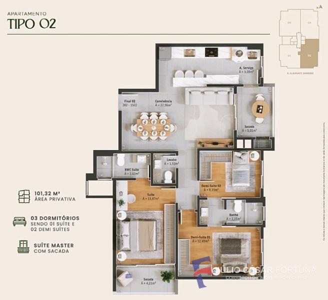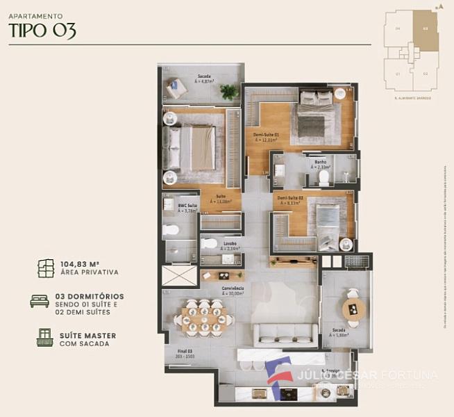 Apartamento 3 dormitórios sendo 1 suíte (ou 3 dormitórios sendo 1 suíte e 2 Demi Suítes), 92,47m² ou 101,32m² privativos, living com 2 ambientes, sacada com churrasqueira, 1 vaga.
