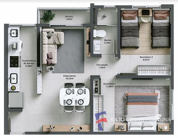 Apartamentos com 2 dormitórios, sacada e 1 vaga coberta.