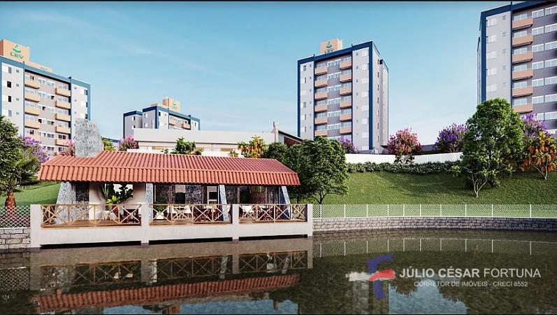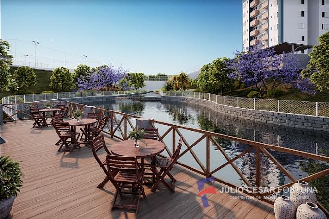 Condomínio com quiosque externo com churrasqueira, salão de festas, quadra de esportes, espaço pet, área de caminhada, piscina e um lindo lago!