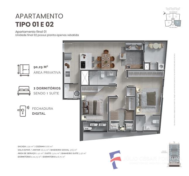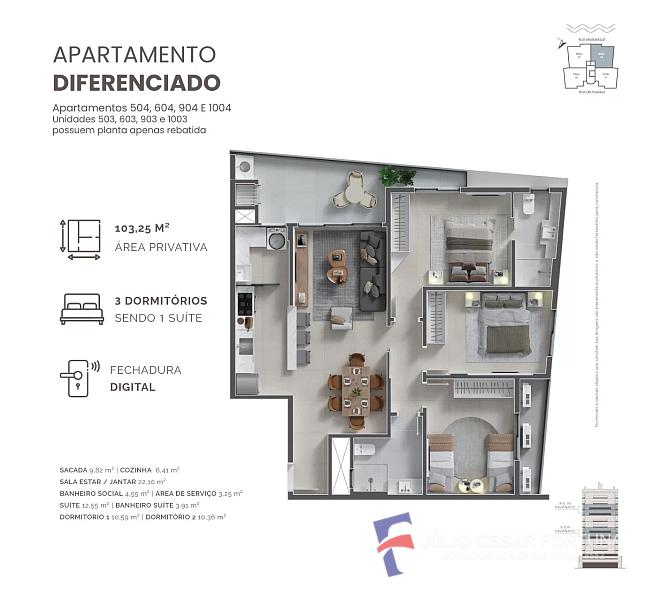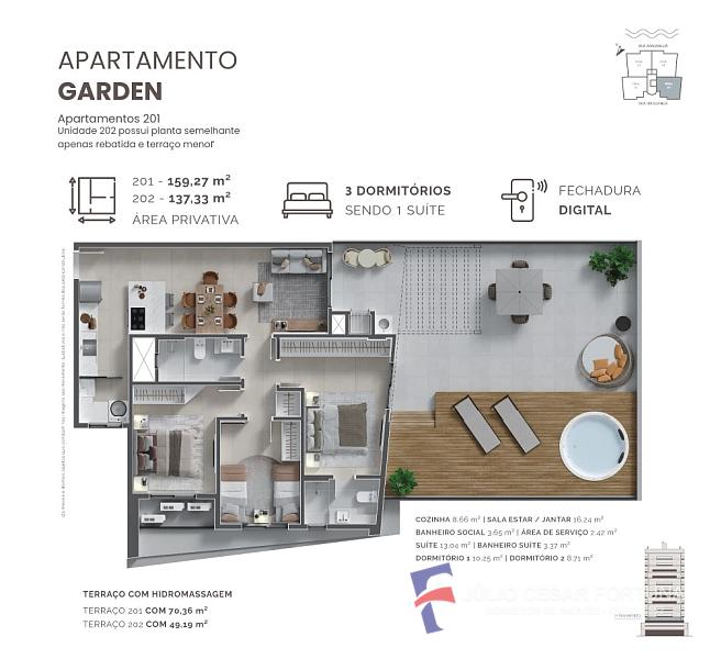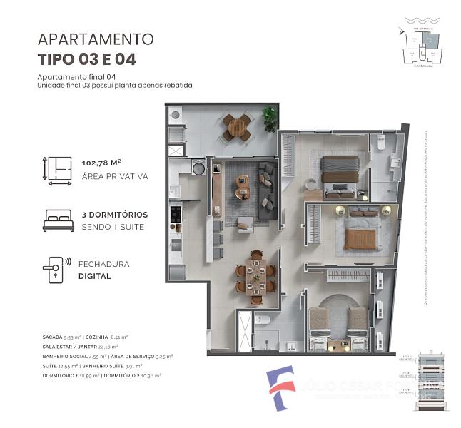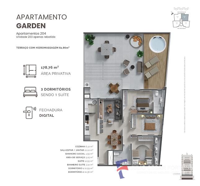 Apartamento 3 dormitórios sendo 1 suíte, até 103m² privativos, fechadura digital, Piscina com prainha, Salão de Festas, Espaço Fitness, Playground, 02 quadras do mar, home box,Terraço com hidromassagem (Apto. Garden), Churrasqueira a carvão, Tubulação para água quente, Sala de estar / cozinha integradas, Espera para split na área comum e dormitórios, Espera para máquina de lavar louça, Janela com persiana integrada, Teto rebaixado em gesso, Piso porcelanato retificado, Laje técnica para máquina de ar condicionado.