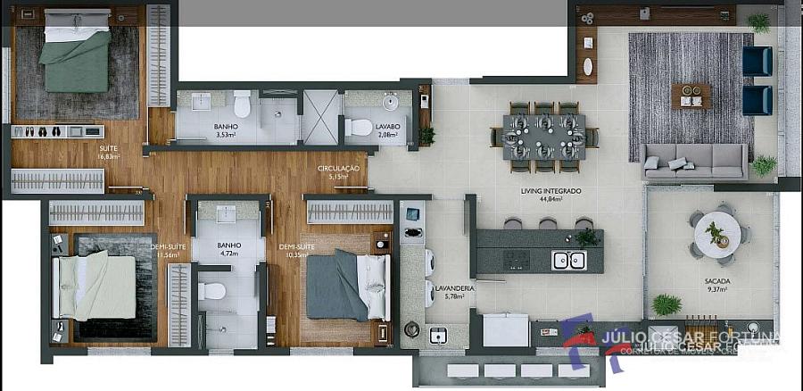 Amplo apartamento 3 dormitórios, sendo 1 suíte master e 2 demi suítes, living espaçoso com 2 ambientes e integrado com a cozinha e com sacada com churrasqueira, lavabo, área de serviço separada, 01 vaga dupla de gararem com carregamento para carro elétrico.