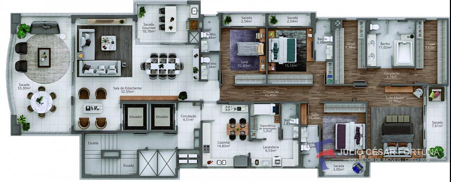 Apartamentos 1 por andar, com 4 suítes com sacada, amplo living, sacada goumert com churrasqueira, lavabo, dependência de empregada com banheiro auxiliar.