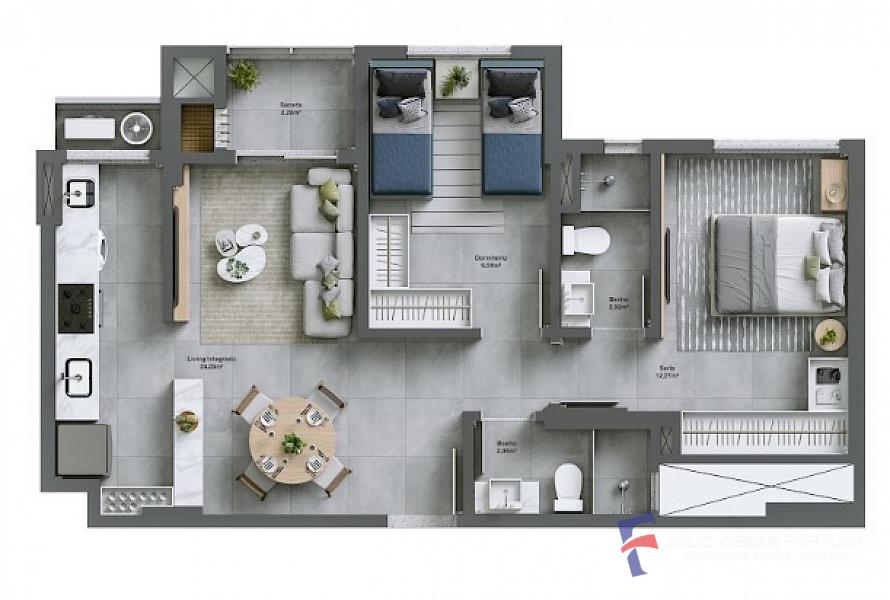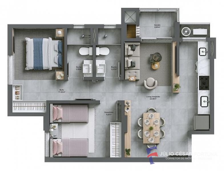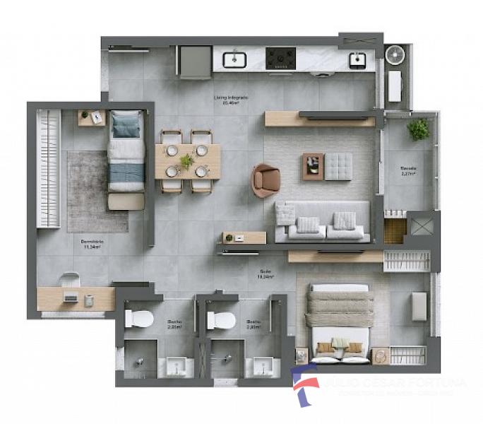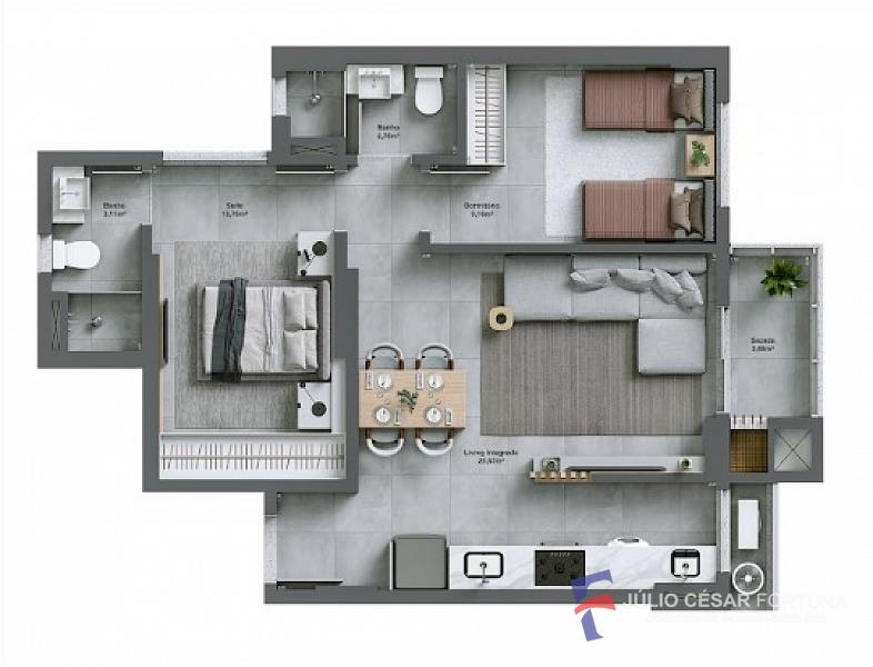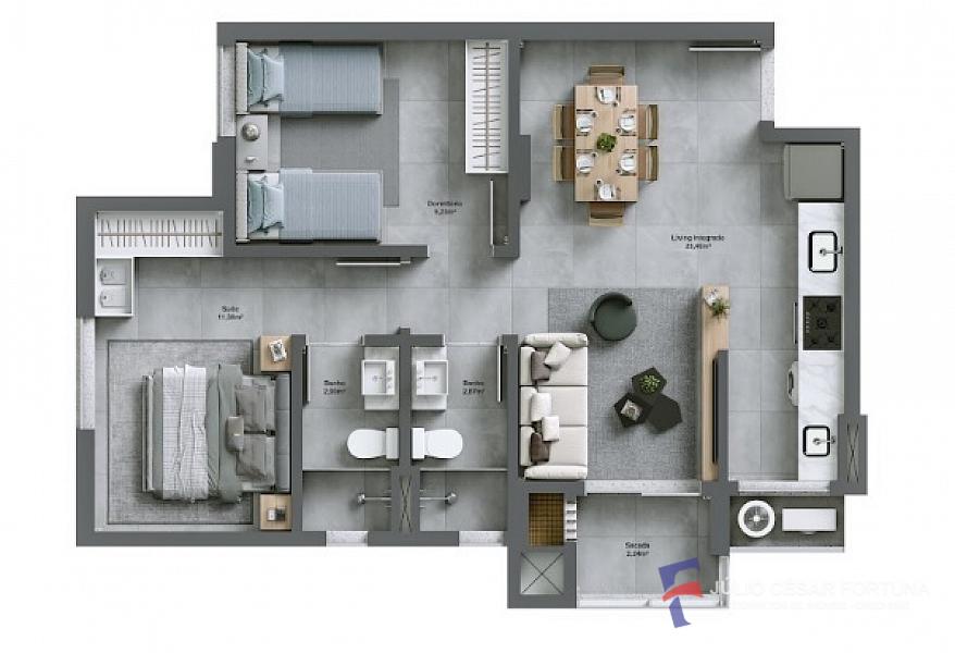 Apartamentos com 2 dormitórios sendo 1 suíte, living com 2 ambientes, sacada com churrasqueira à carvão, 1 vaga.