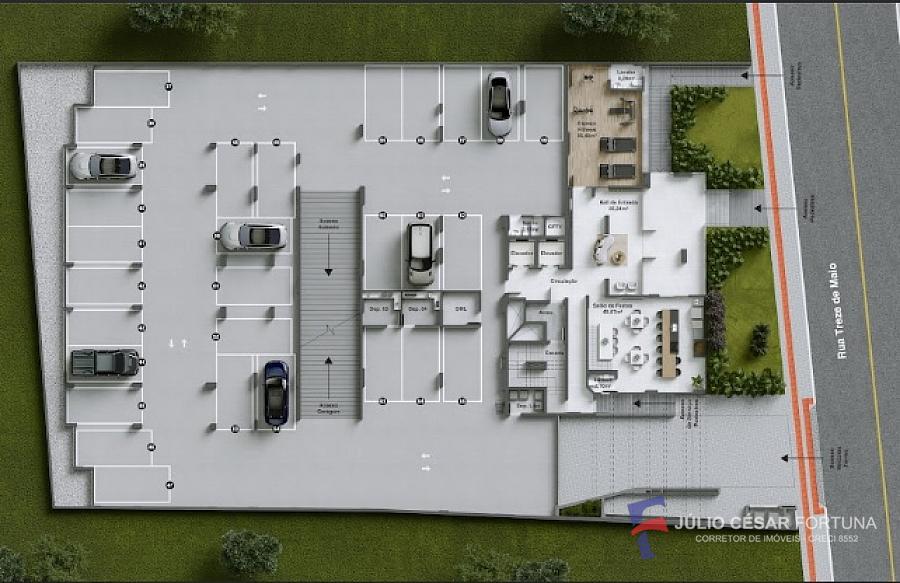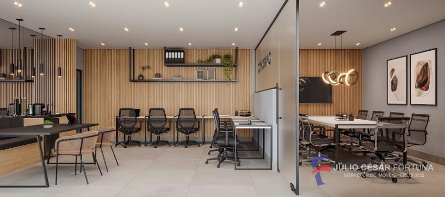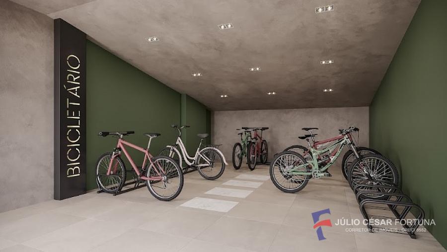 Condomínio com bicicletário, salão de festas, sala de jogos, academia coworking.