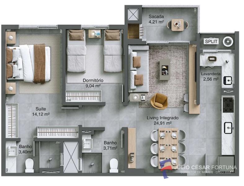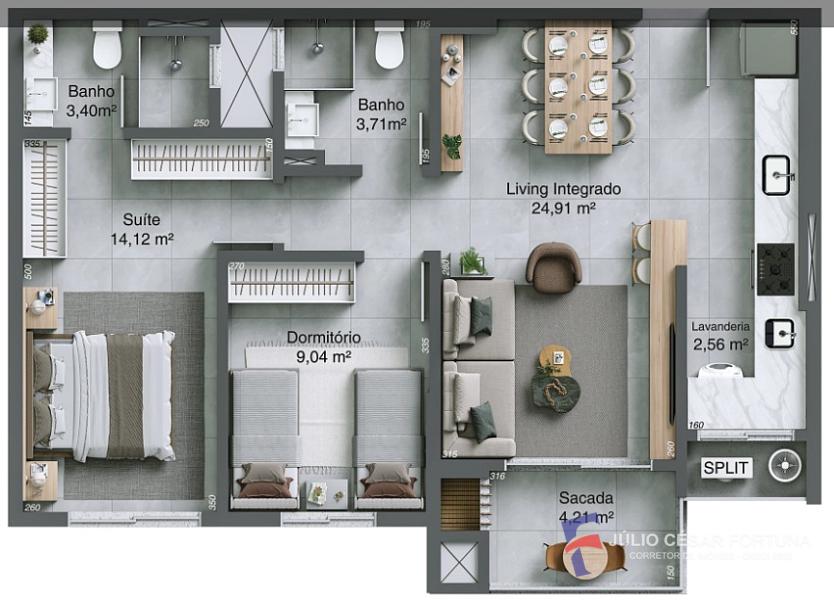 2 dormitórios (1 suíte)