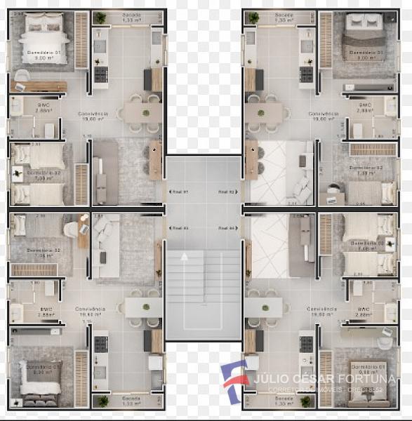Apartamentos 2 dormitórios, sacada, living 2 ambientes, cozinha e área de serviço, banheiro social. 01 vaga de garagem.