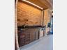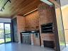Espaço gourmet com churrasqueira, fogão a lenha e banheiro