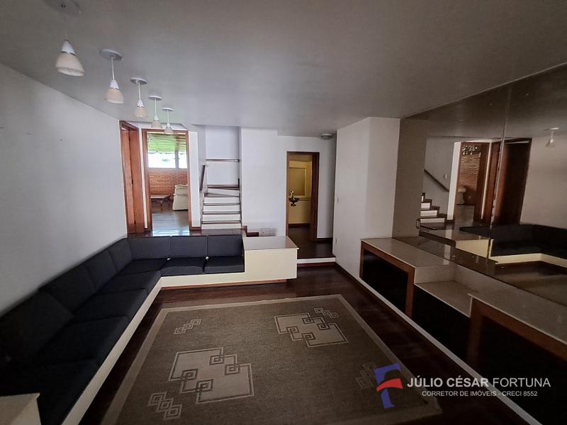 Andar inferior: sala de estar/jantar, estar intimo, escritório, cozinha, lavabo, área de serviço, dependência de empregada com banheiro, garagem com espaço para até quatro carros e churrasqueira a carvão.