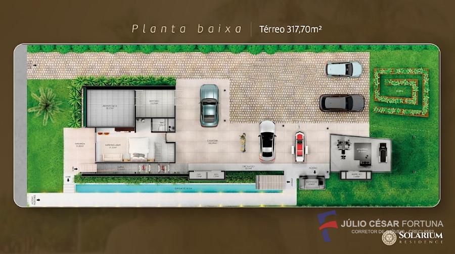 Pavimento térreo conta com: Garagem, Suíte exclusiva, Suíte Alternative (Academia), Depósito, Área técnica, Escadaria de acesso ao superior, Armário de inspeção, Lixeira, Armário do Gás e Deck da suíte. Pavimento Superior: Dormitórios Suíte 01 e 02, Suíte Master, Sacadas, Circulação, Cozinha Gourmet, ampla Sala de estar, Lavanderia, Lavabo, Banheiro social, Deck e Piscina.