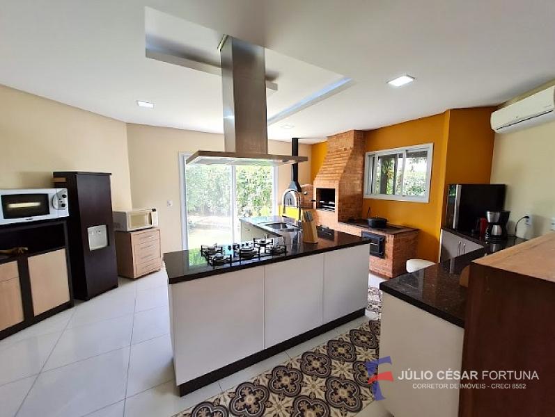Na cozinha integrada com a sala, tem uma ilha gourmet, fogão a lenha, forno de pizza e churrasqueira a carvão.