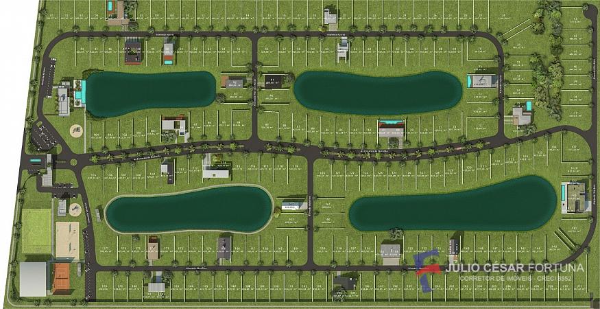 Infraestrutura: Áreas de lazer, esportes, pavimentação asfáltica, projeto de segurança condominial, rede coletora e tratamento de efluentes, lagos artificiais.
