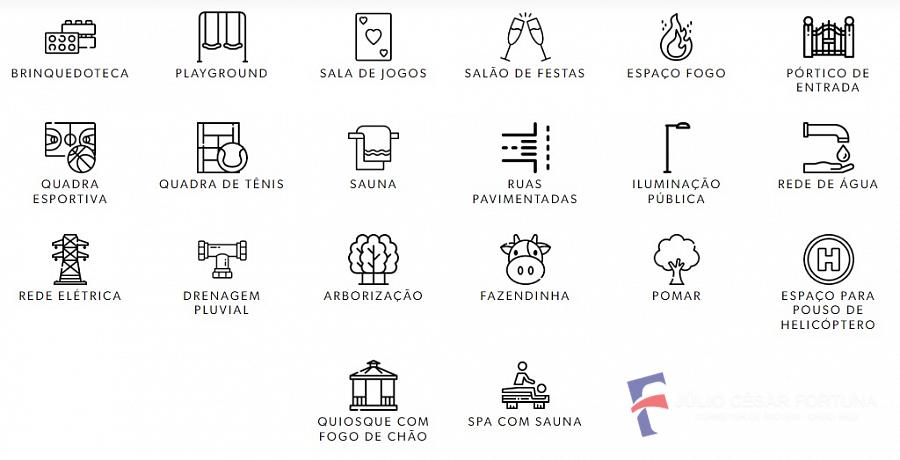Ruas pavimentadas, terrenos com matrículas individuais, infra estrutura de lazer completa: salão de festas, espaço fogo, quiosque com fogo de chão, play ground, sala de jogos, quadra de tênis, quadra poliesportiva, spa com sauna, fazendinha, heliponto, pomar, pórtico de entrada....
